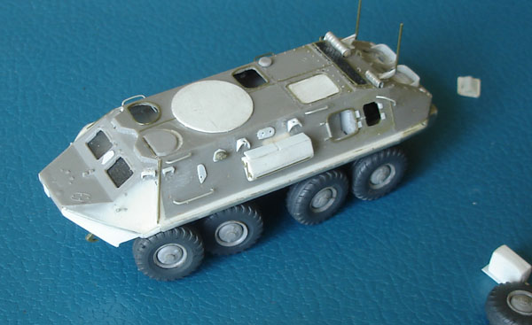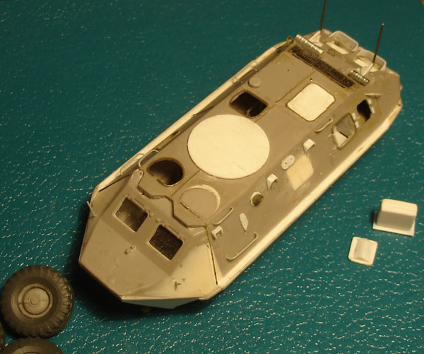 Из доширака и тянутого литника делаем створки шахты радиаторов. Установка створок и защитного ограждения будет произведена после покраски БТРа.